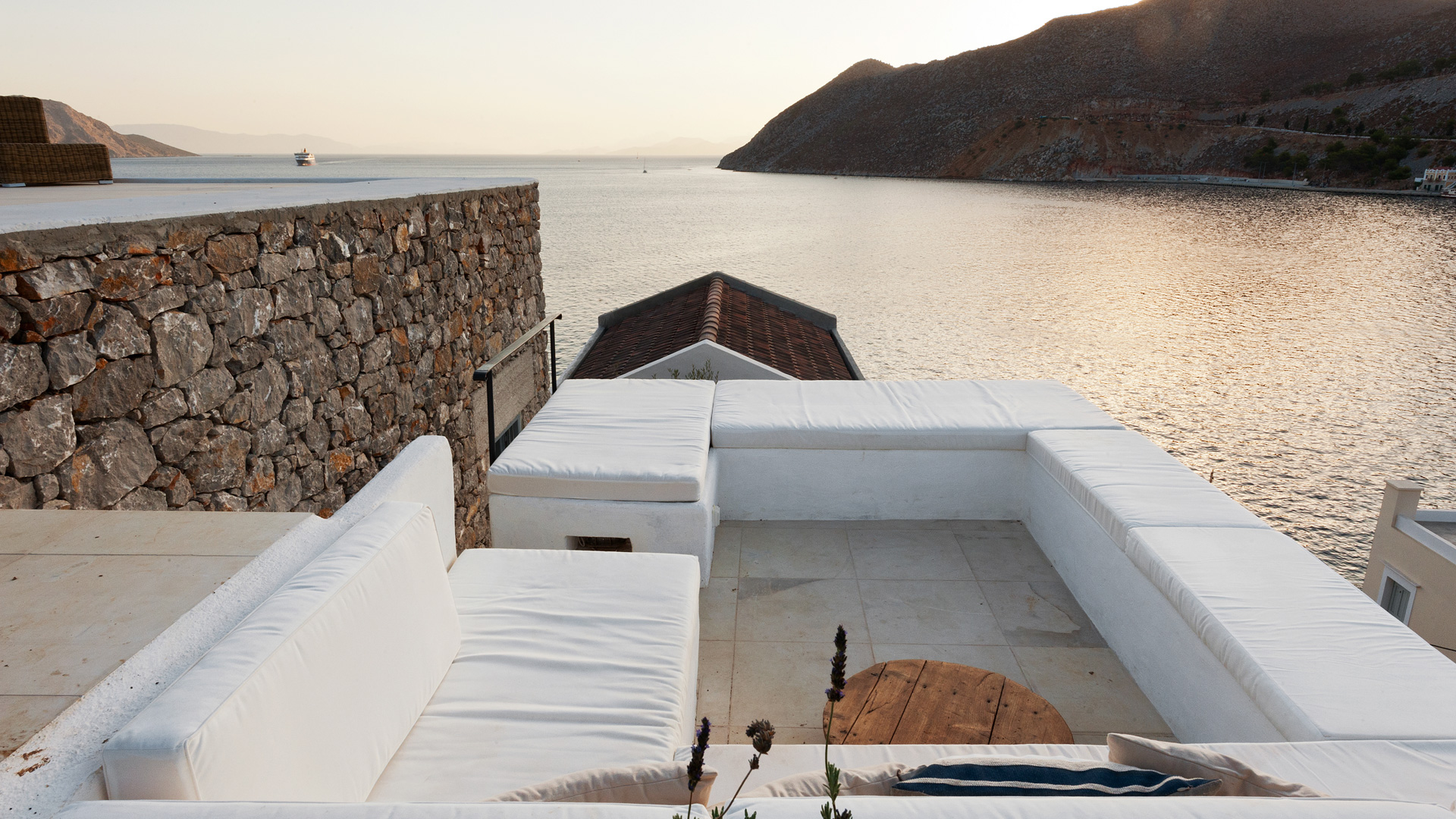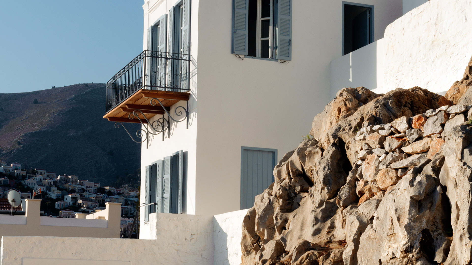 The project was designed and built on a vertical rock overlooking the Aegean Sea. Horizontal cut sections through the rock allowed the buildings to anchor and rest into the slope. The rocks extended vertically to become the plastered and then whitewashed walls of the house. The connections between the buildings became the stairs, the paths and terraces. Full grown olive trees and lightweight pergolas provide shelter from the summer sun.