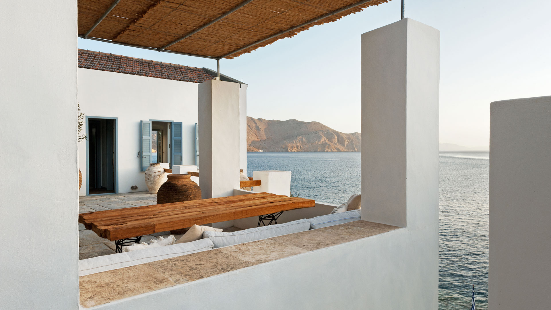 The project was designed and built on a vertical rock overlooking the Aegean Sea. Horizontal cut sections through the rock allowed the buildings to anchor and rest into the slope. The rocks extended vertically to become the plastered and then whitewashed walls of the house. The connections between the buildings became the stairs, the paths and terraces. Full grown olive trees and lightweight pergolas provide shelter from the summer sun.